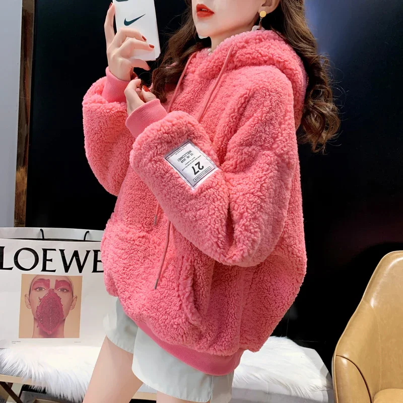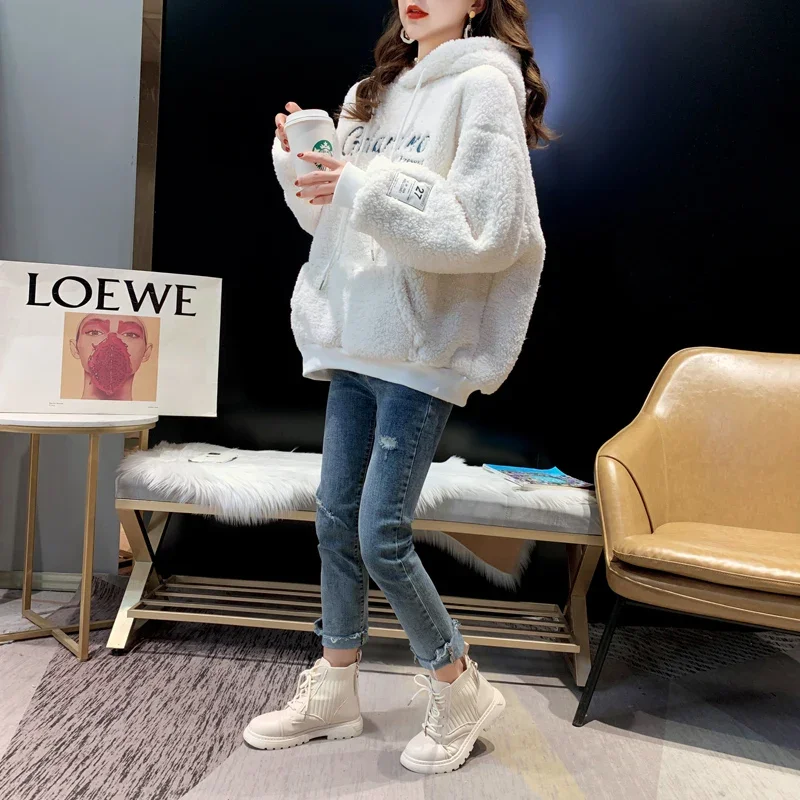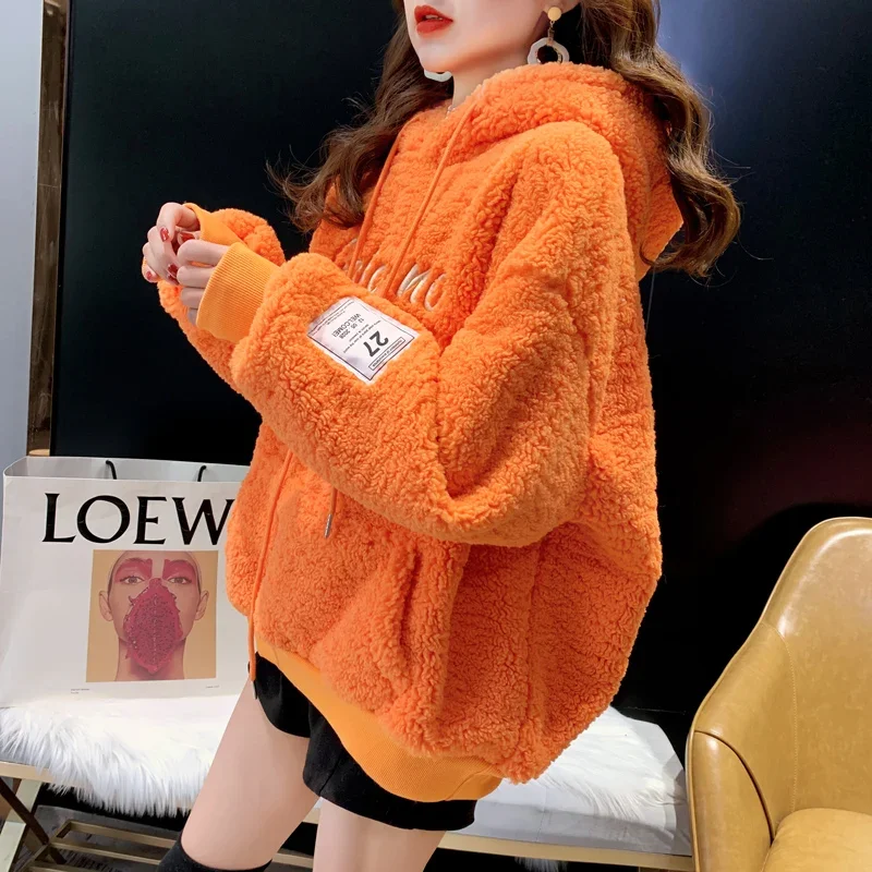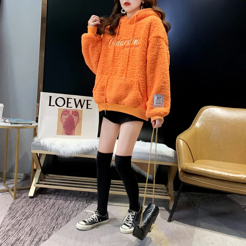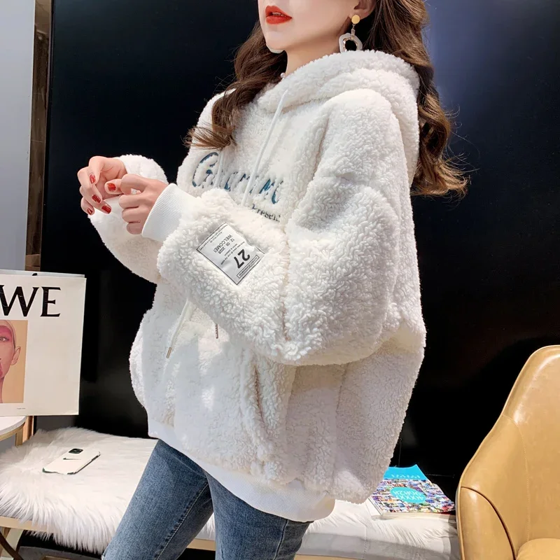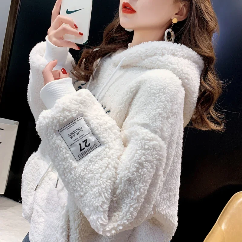 2025 New Women's Hooded Sweatshirt Lamb Velvet Embroidered Letter Korean Version Loose Fit Cross-Border Design Sense