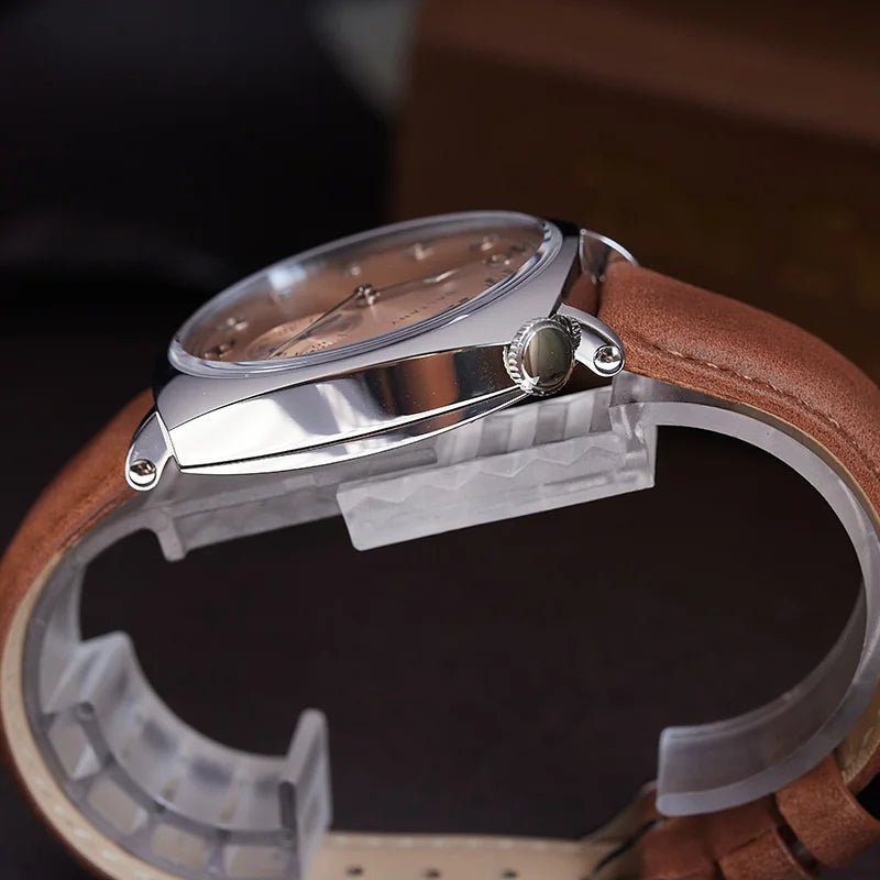 The watch comes with a 20mm wide brown leather strap, soft and comfortable with a premium tactile feel. The fine leather texture complements the dial design, providing an elegant look while offering a comfortable wearing experience. The strap is paired with a 316L stainless steel buckle, ensuring durability and easy adjustment, making it suitable for various occasions.