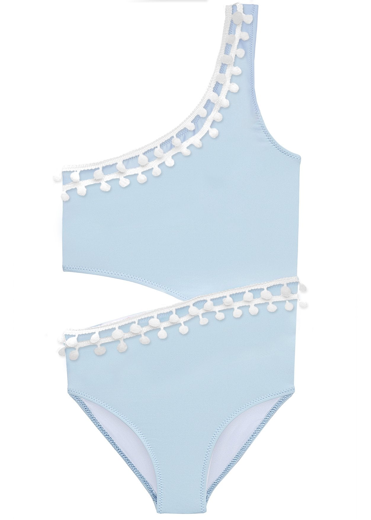 Baby Blue Bathing suit with white pom poms and side cut. See also matching cover ups.