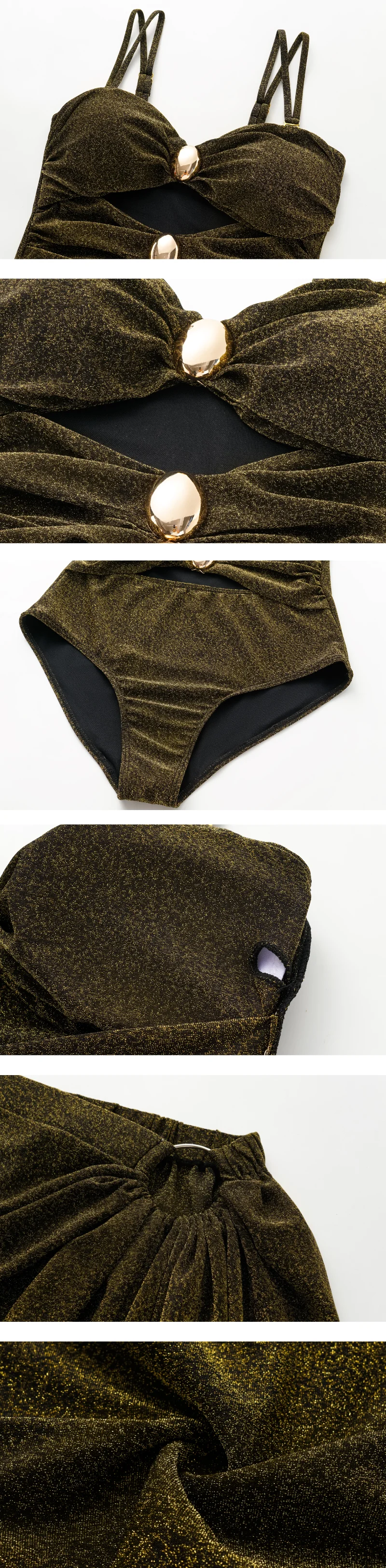 Flaxmaker Gold Glitter Cutout Fabric Women Bikini Set One Piece Swimsuit Swimwear Women Sexy Bikini Beach Wear Bathing Suit