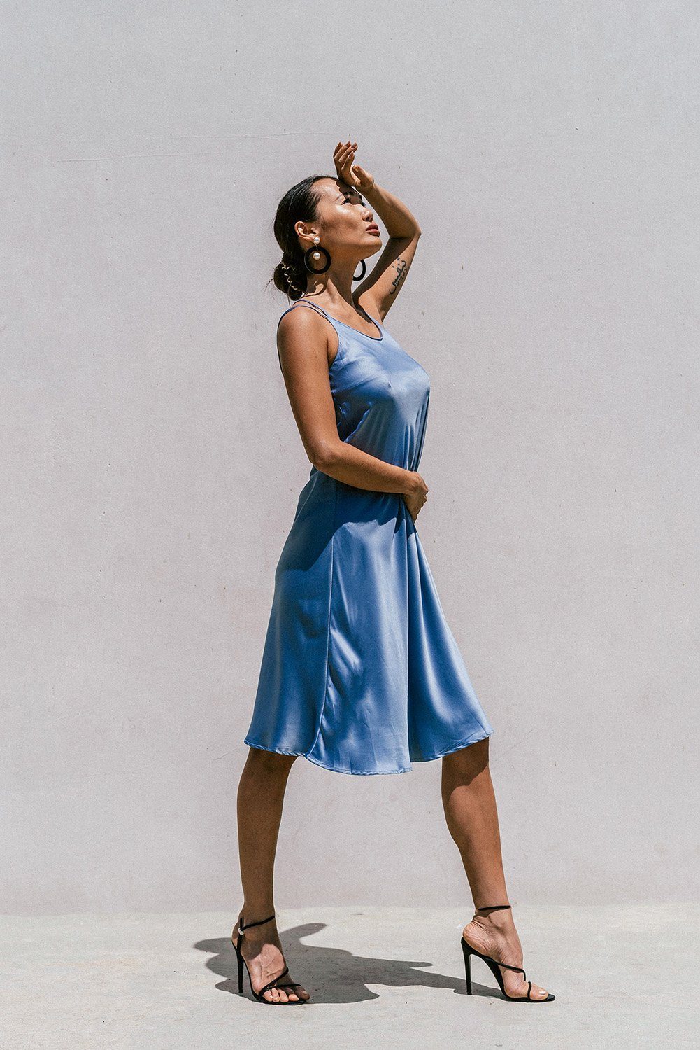 Silky smooth slip dress crafted in luxurious lightweight satin for those blissful summer days. Featuring a rounded neckline, delicate double straps, and super flattering A-shape silhouette. Available in more colors.