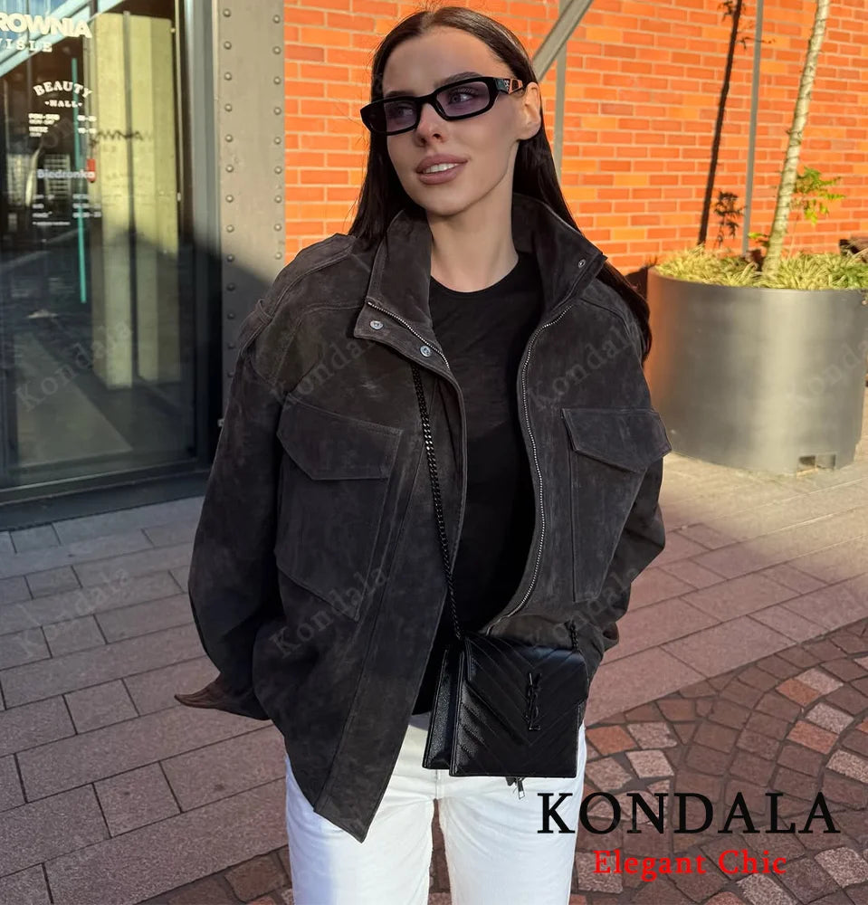 KONDALA Autumn Women Elegant Suede Jacket Stand-up Collar Grey Zipper Loose Jacket 2025 Fall Winter Streetwear Lady Jacket