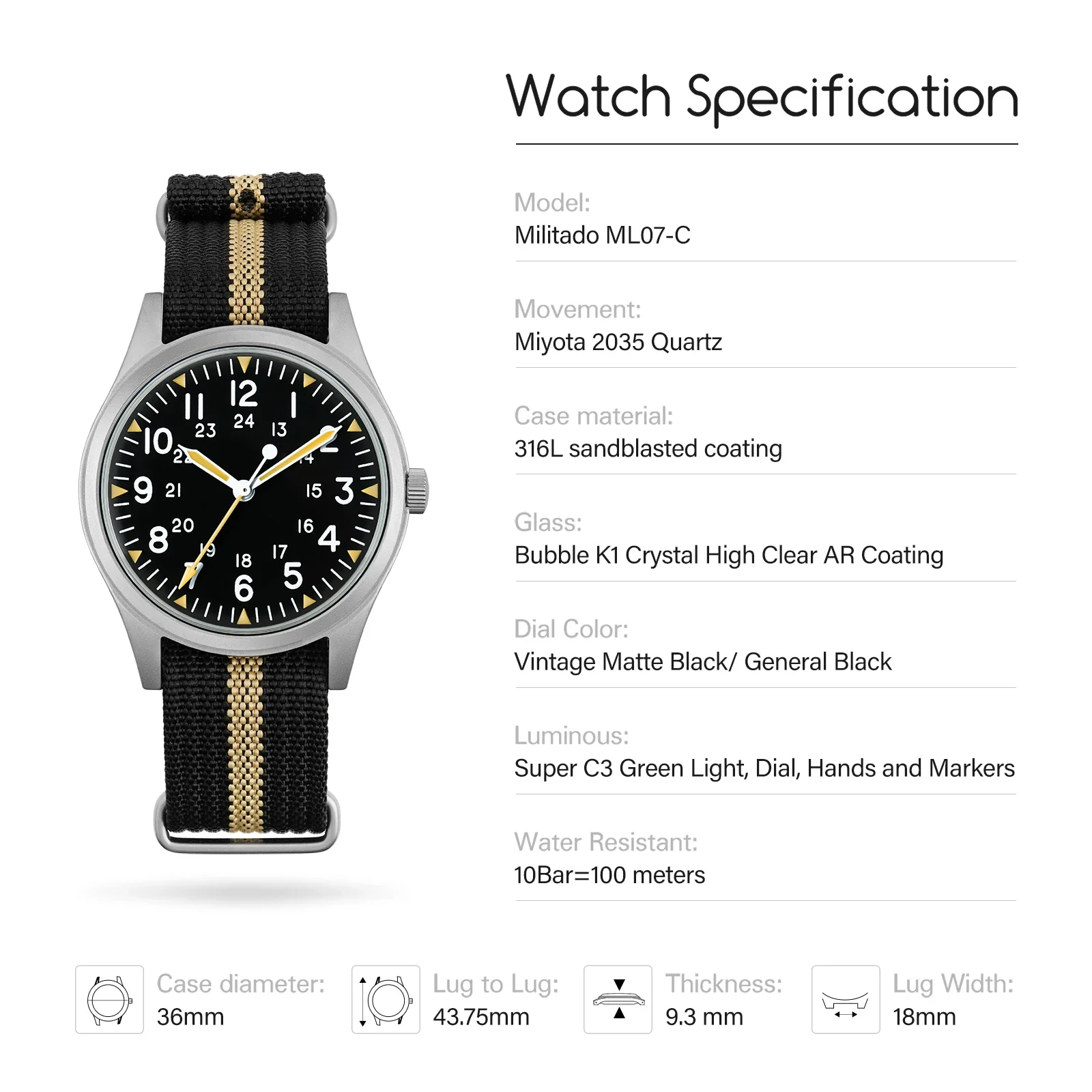 Militado ML07 Vintage Watch Miyota Super 2035 Movement Domed Sapphire Crystal C3 Luminous 10Bar Waterproof 36mm Military Watches