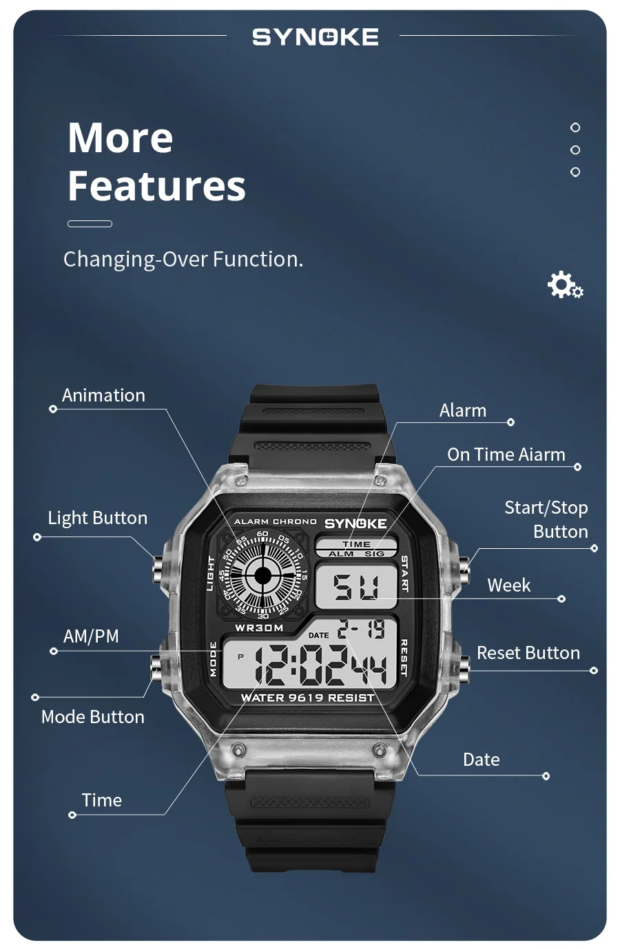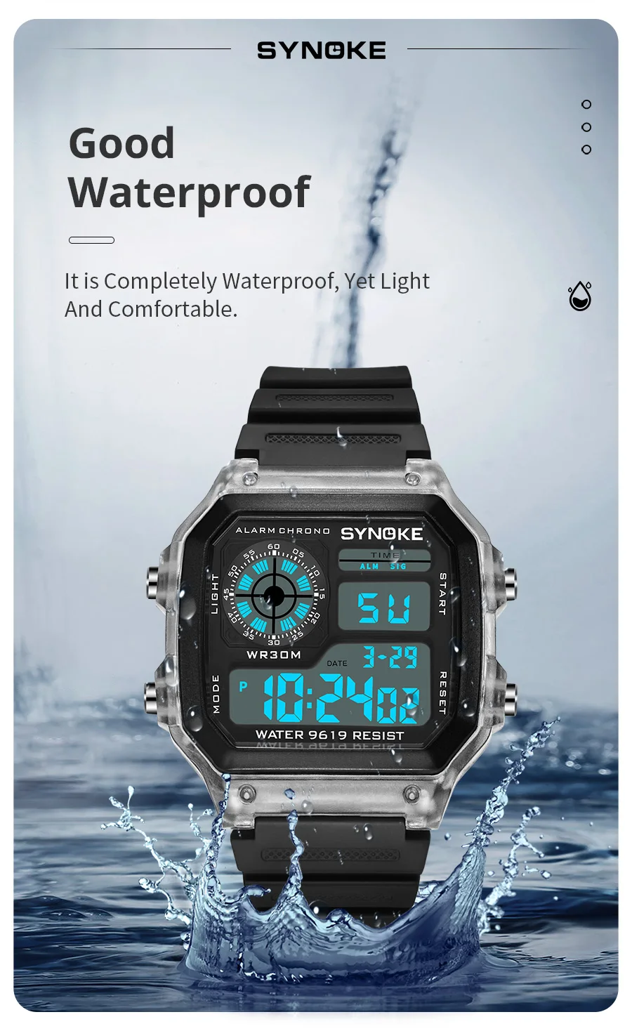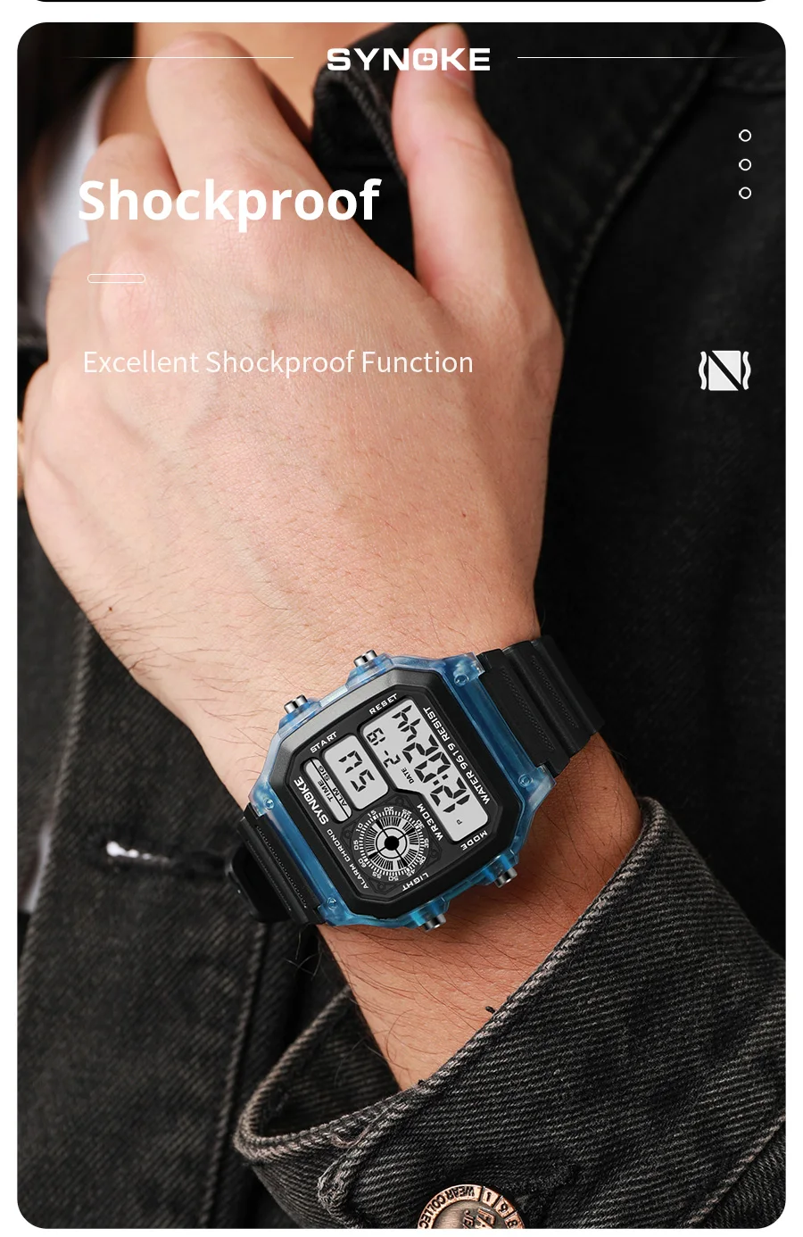 SYNOKE Wrist Watch For Men Digital Sports Waterproof Watch Transparent Multifunction Chronograph Alarm Backlight reloj hombre