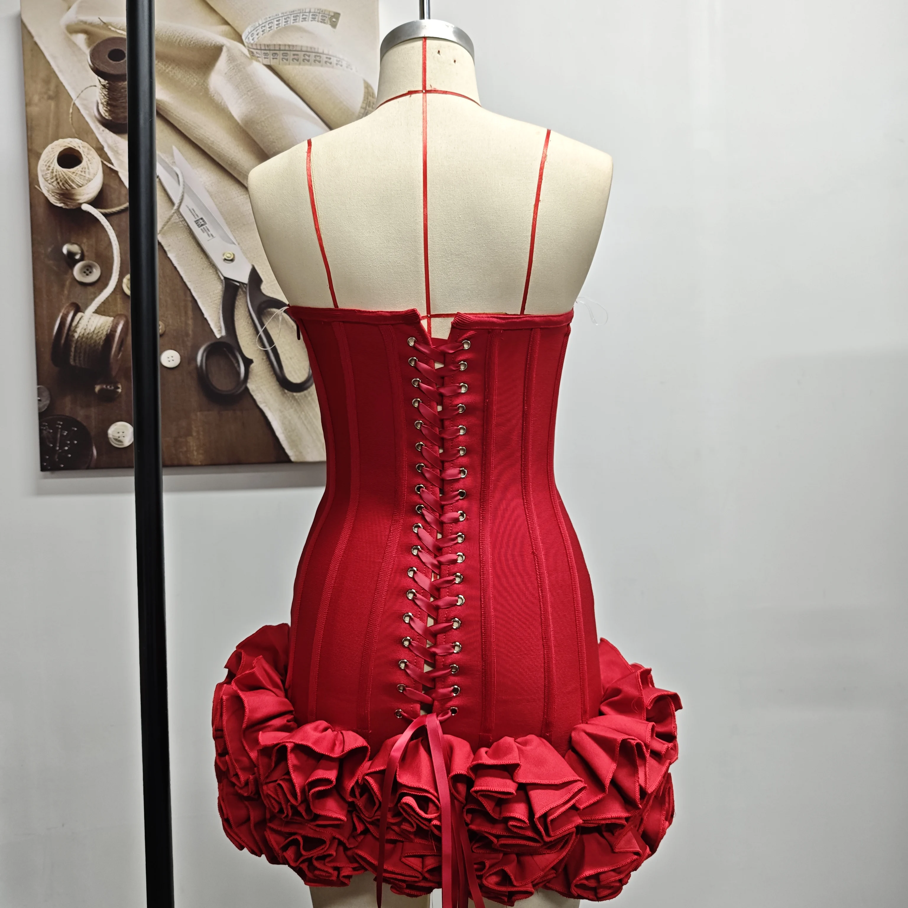 VC Christmas Dress Strapless Backless Red Structured Floral Embellished Mini Length Bodycon Celebrity Party Cocktail Dress