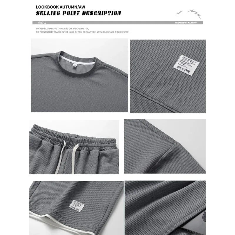 Waffle Pattern 3 Piece Men Short Sleeve Shorts Set Harajuku Japan