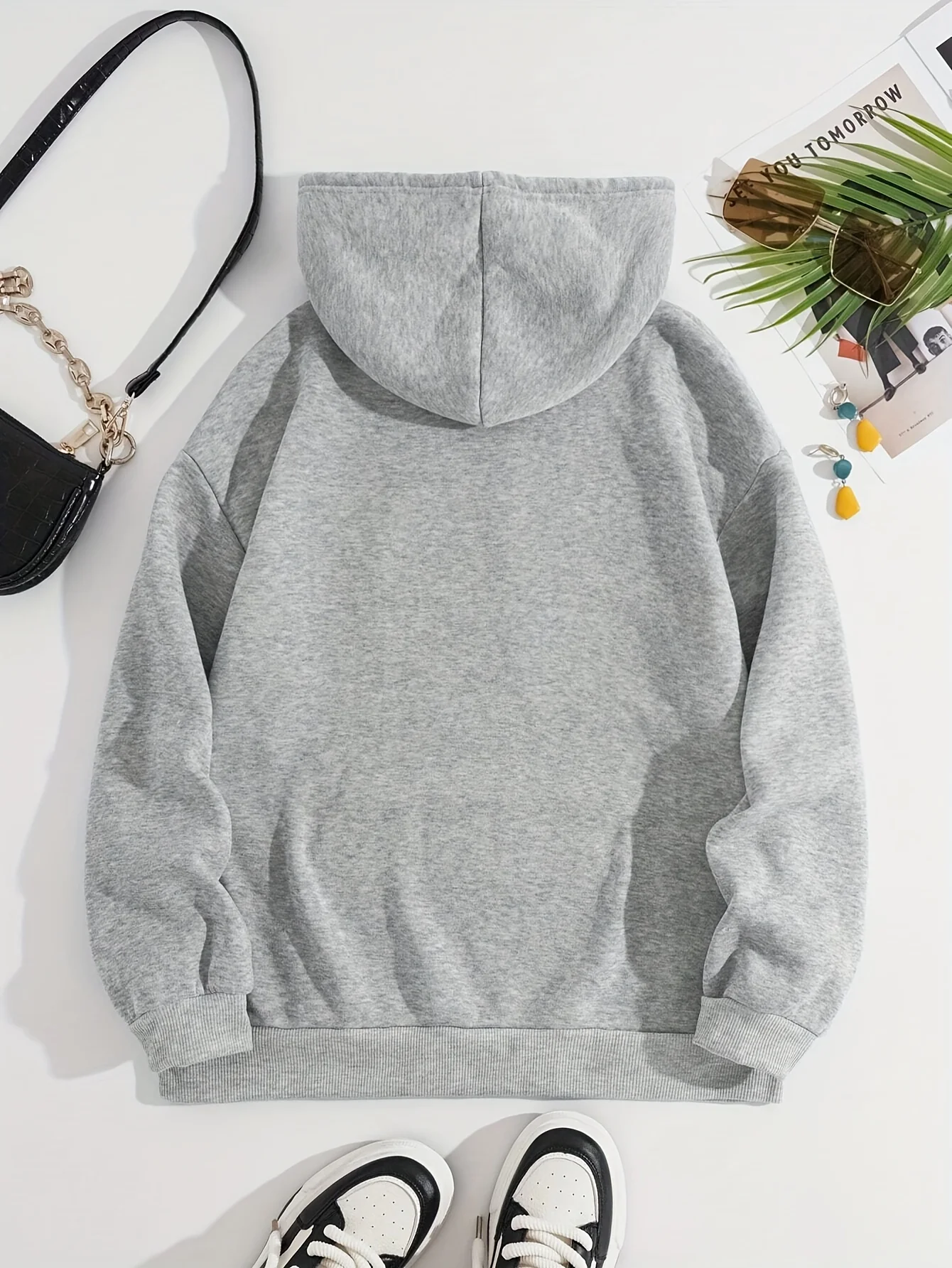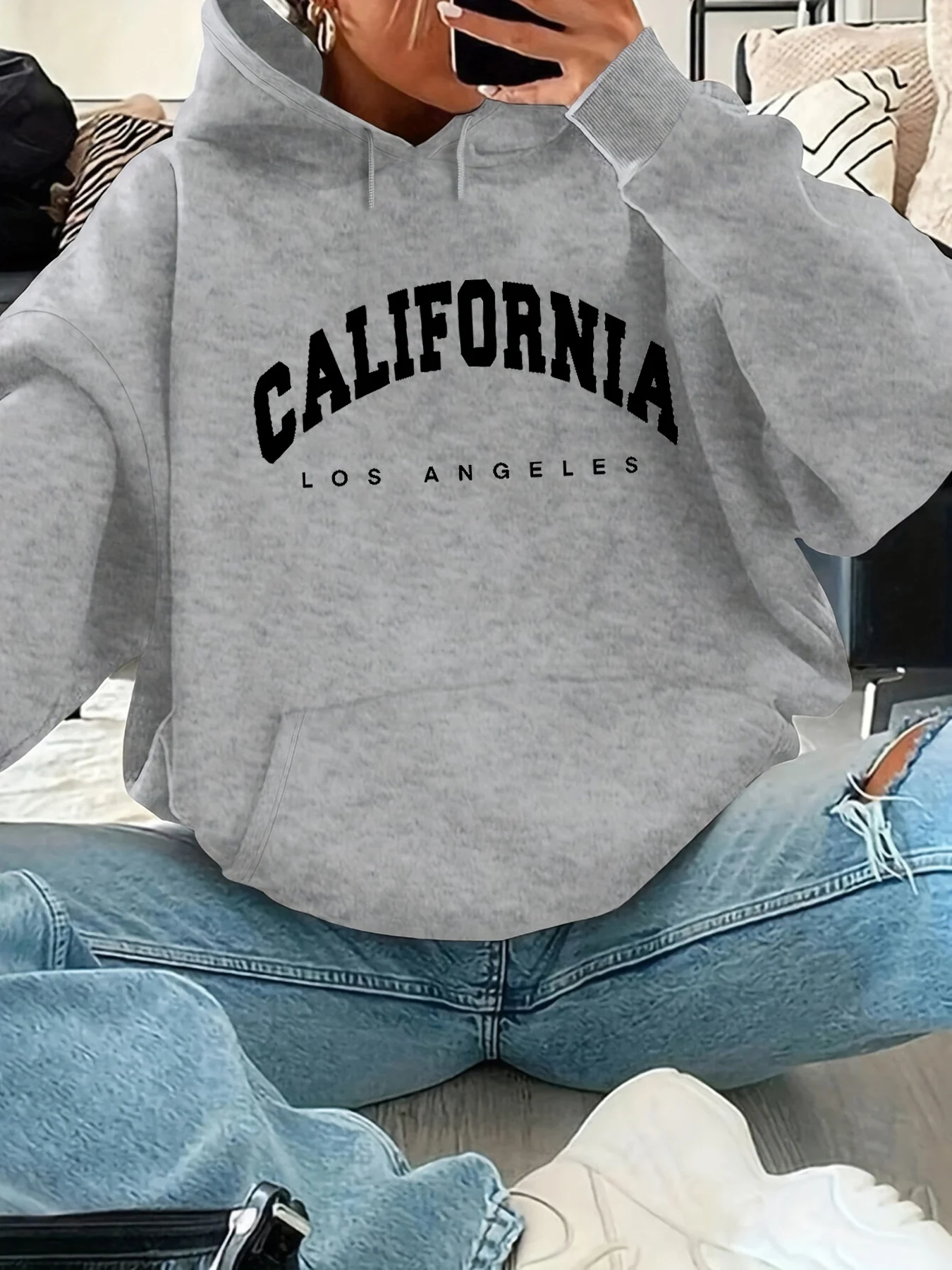 Women's autumn and winter warm and loose casual California Los Angeles pattern printed suede long sleeved hooded sweatshirt